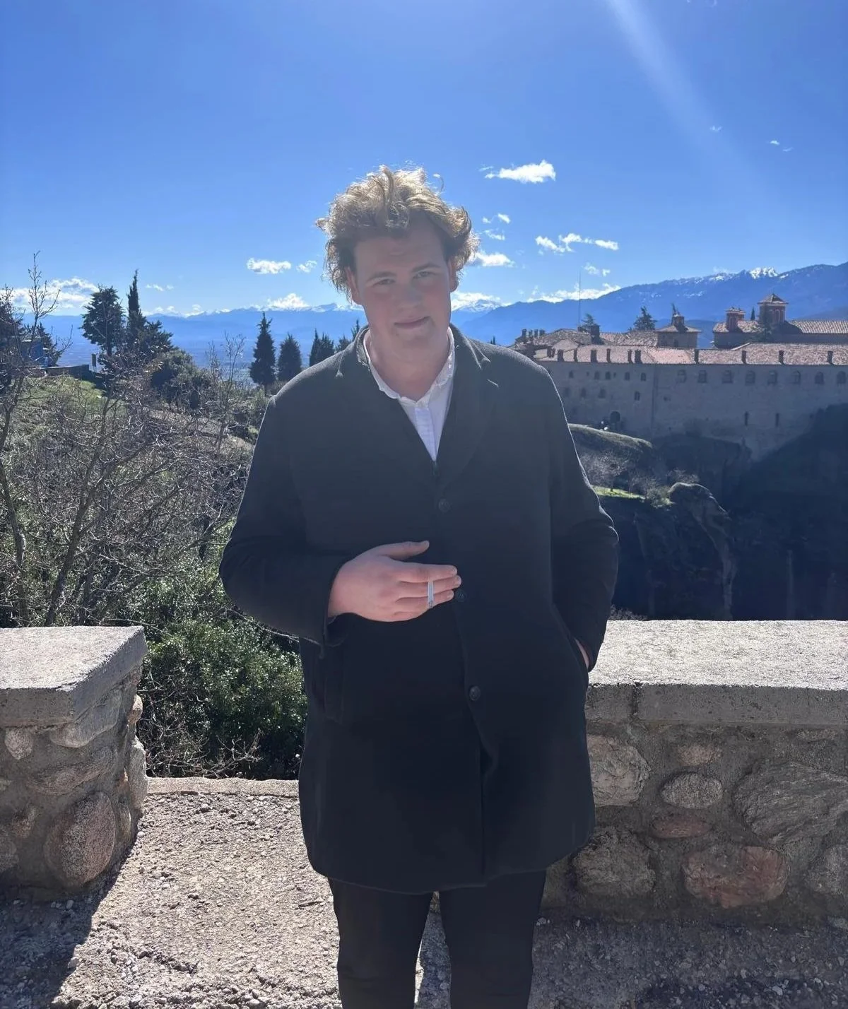 Vice-Praeses Ties van Assen met één van de Meteorakloosters op de achtergrond. Foto door Z.G. Wassink.