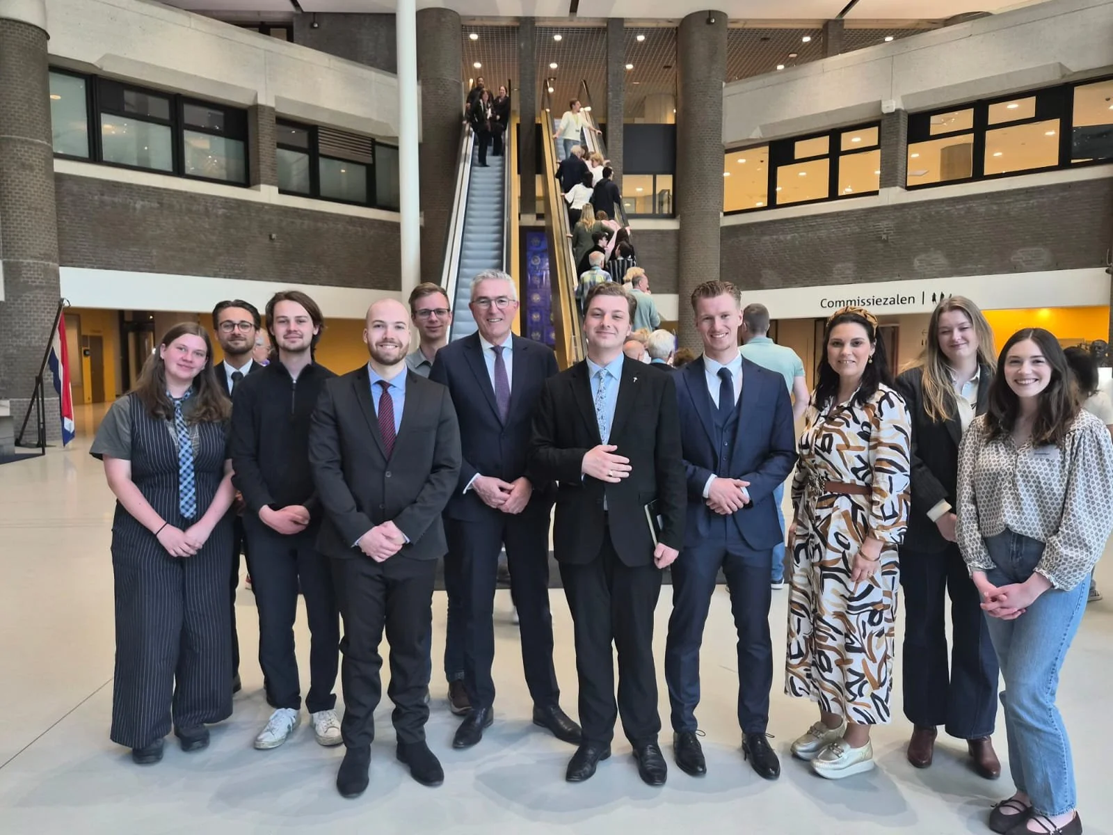De leden, participanten en gasten van Studievereniging Ad Interim met CDA-Kamerlid Henk Jumelet (midden) in de centrale hal van het tijdelijk gebouw van de Tweede Kamer. Foto door R. Brasser.