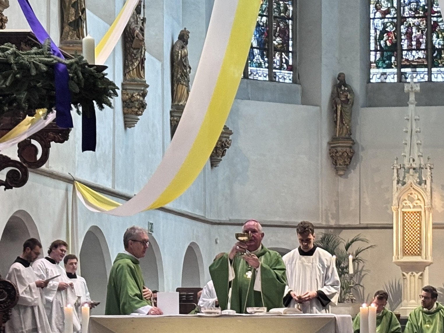 De Heilige Mis startte om 11 uur in de St. Catharinakathedraal. Hierbij was Zijne Hoogwaardige Excellentie Monseigneur Hoogenboom hoofdcelebrant. Verder waren er concelebranten die op verschillende wijzen verbonden waren aan de TST. De seminaristen van het Ariënsintituut waren daar, samen met onze praeses, misdienaar. De hulpbisschop vroeg ons te bidden voor de gezondheid van Kardinaal Eijk, die helaas thuis moest blijven.